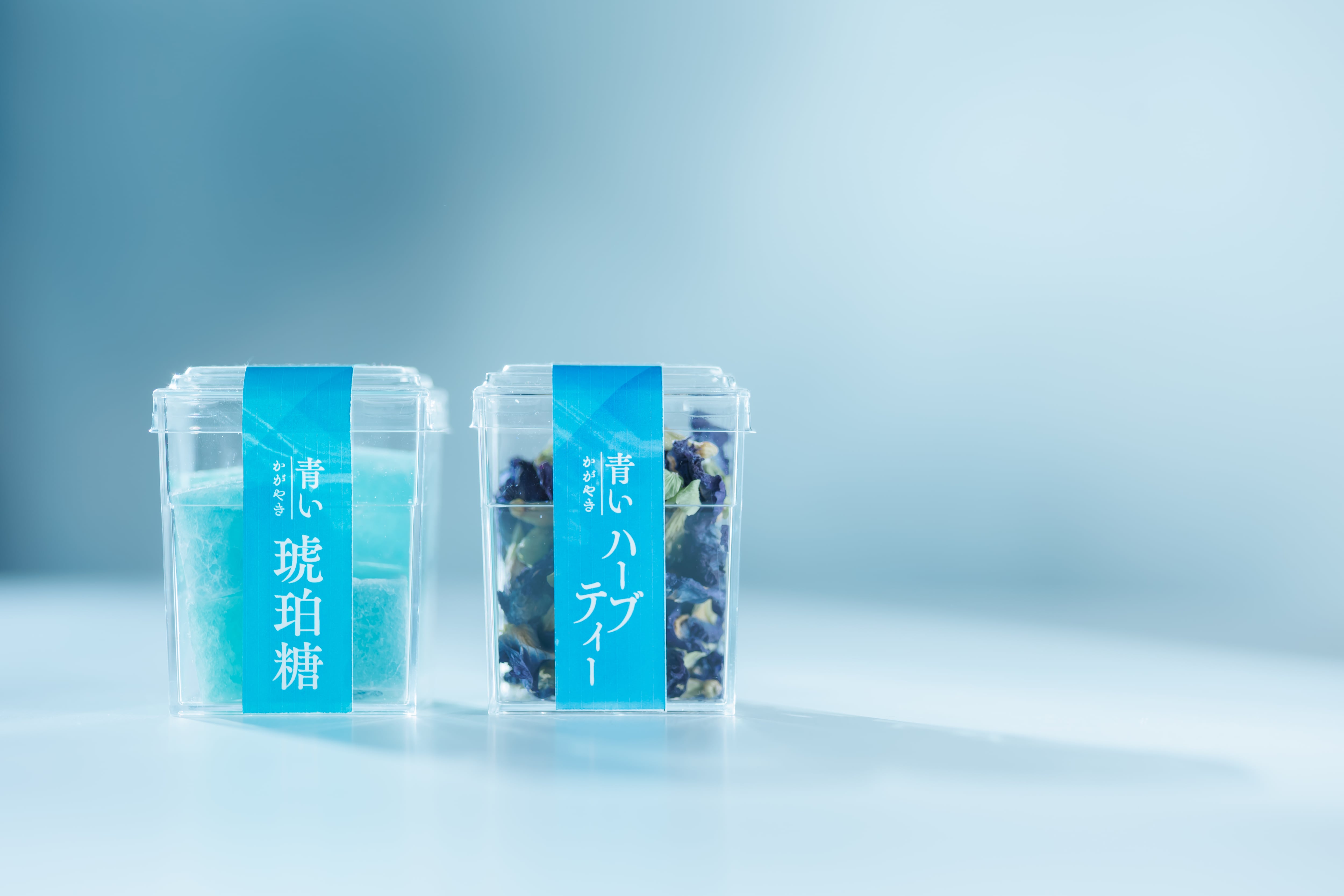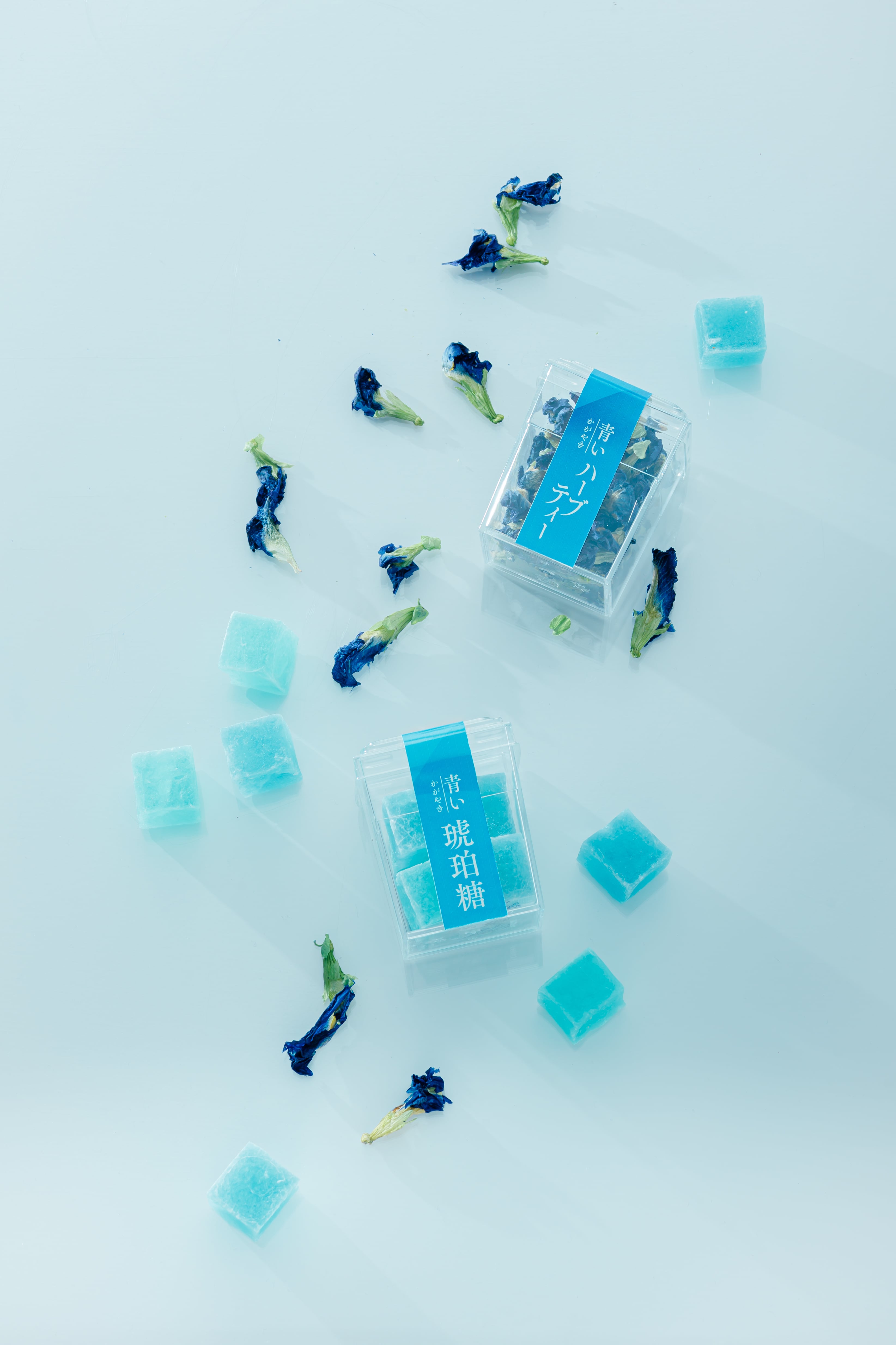 【青いかがやき琥珀糖】 グラニュー糖、寒天、バタフライピー